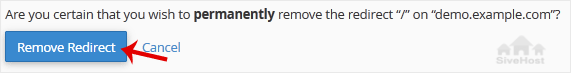 3. Scroll down to the end of the page. Under Current Redirects, locate the domain and click on remove.