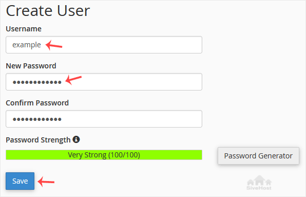 7. Scroll down the page. Under Create User, fill in the username and password fields or use the Password Generator option to generate a new random password and copy it to Notepad. Click on Save.
